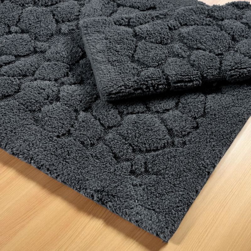 Dywaniki wyróżniają się subtelnym, wytłoczonym wzorem, który nadaje im eleganckiego i nowoczesnego wyglądu. Grafitowy kolor doskonale komponuje się z jasnymi i kontrastowymi aranżacjami – pięknie podkreśla biel, szarości, drewno czy odcienie beżu. Starannie wykończone krawędzie oraz trwała bawełna gwarantują, że dywaniki zachowają swój wygląd i miękkość przez długi czas. Prostokątny kształt sprawia, że zestaw łatwo dopasować do łazienek o różnych rozmiarach i układach.