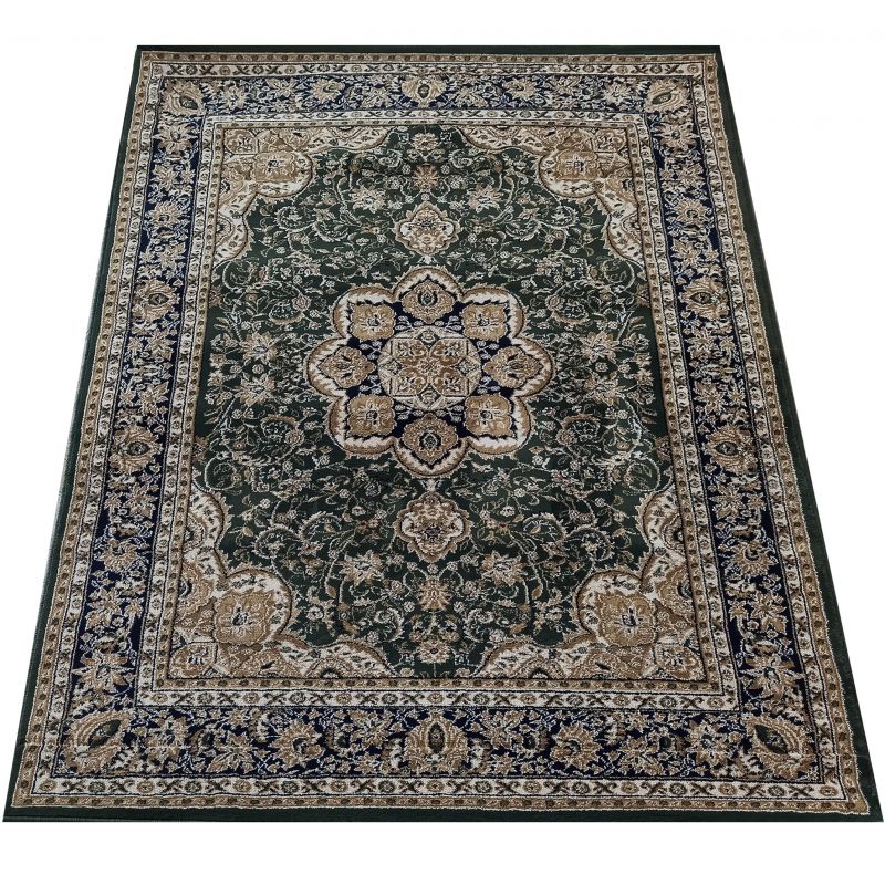 Dywan tradycyjny w kolorze zielonym. Zdobiony w sposób klasyczny, wzór, który czerpie całymi garściami z klasycznej sztuki zdobienia dywanów, która sięga wielu wieków wstecz. Dywan świetnie odnajdzie się we wnętrzach salonów i sypialni, zwłaszcza tych reprezentacyjnych i bogato urządzonych.