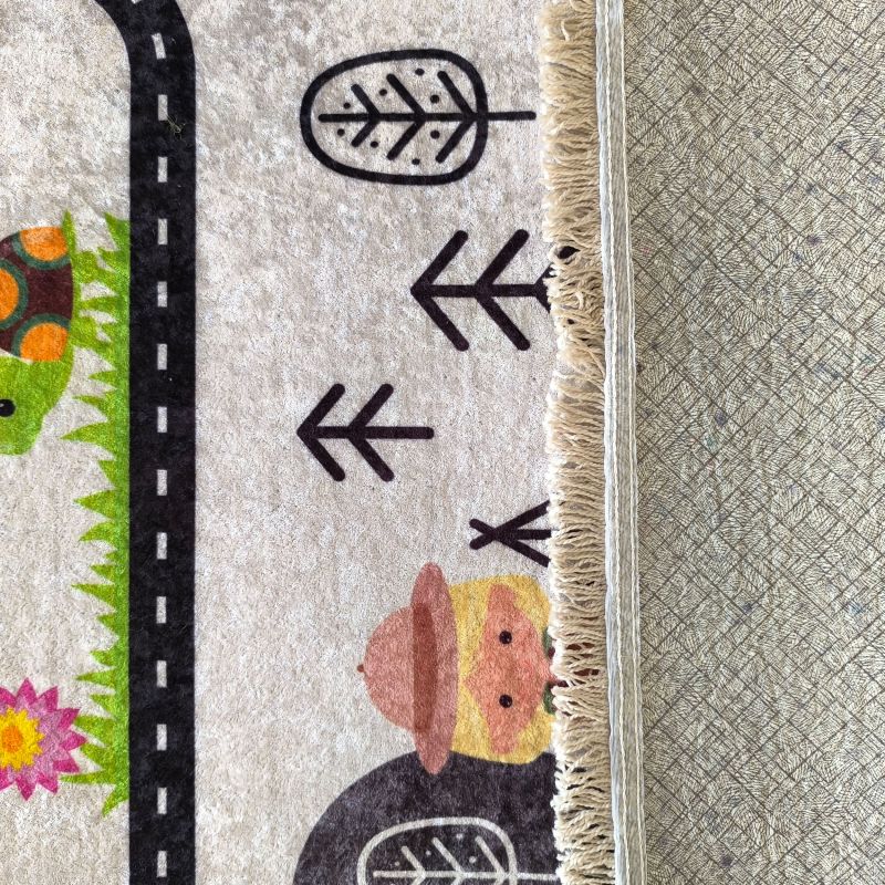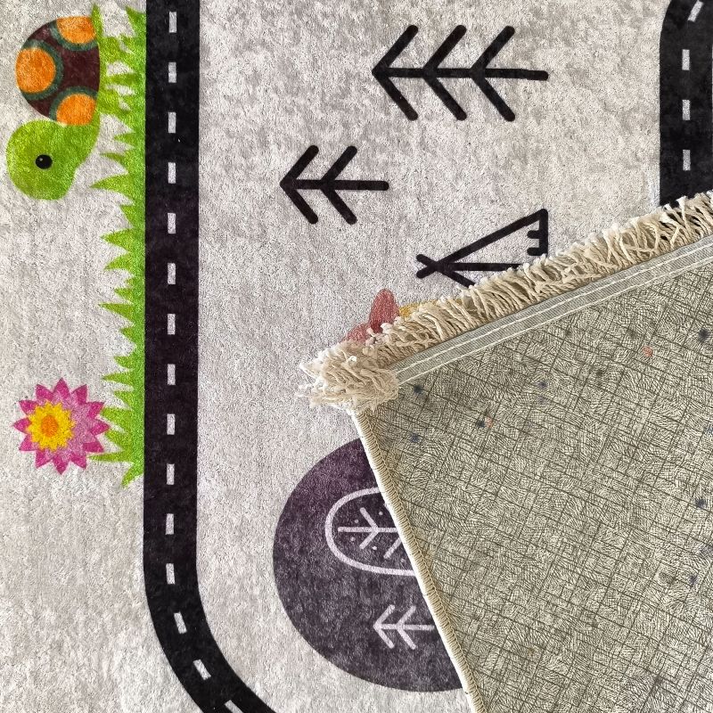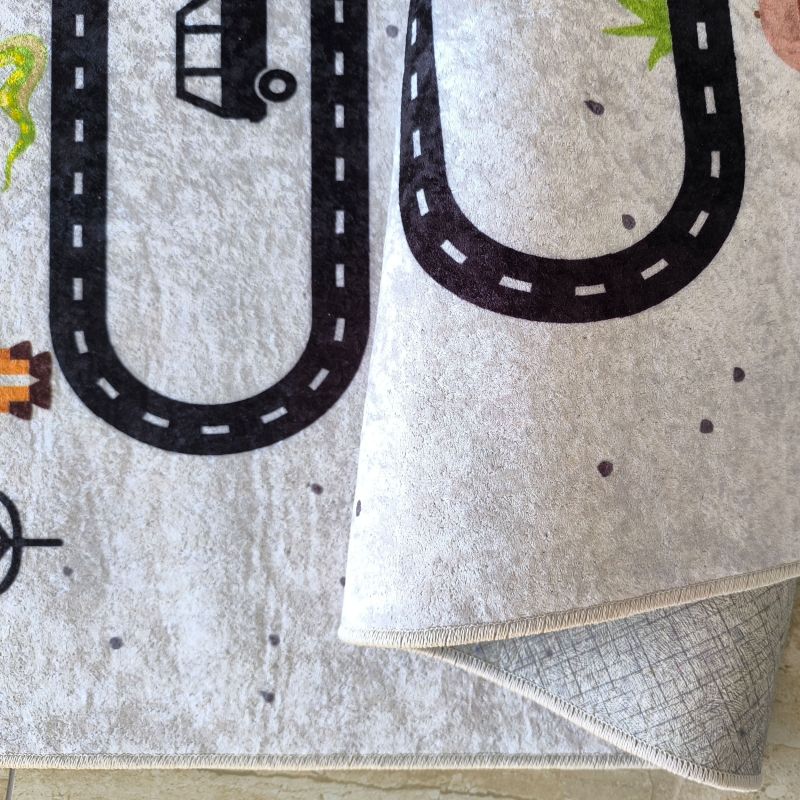 Antypoślizgowy, gumowany spód zapewnia bezpieczeństwo podczas zabawy, a grubość +/- 5 mm sprawia, że dywan wygodnie leży na podłodze, zachowując komfort użytkowania.